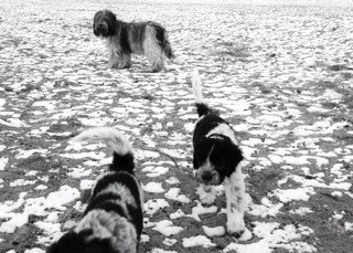 A-Wurf stand heute auf dem Programm. Emma hat sich zu einer hübschen, jungen Dame mit einem sehr sonnigen Gemüt entwickelt. Nach einer kurzen, strengen, mütterlichen Begrüßung hat Lotta dann aber lieber das ausgelassene Spielen Charlie überlassen und sich selber diskret im Hintergrund gehalten. Um fremde Hunde macht Lotta inzwischen sogar einen Bogen, frei nach dem Motto: "Ich bin im Moment bei allem raus!" Während Charlie beim A-Wurf noch Bauklötze über Lottas Verhaltensänderungen zu staunen schien und mich diverse Male fragend anschaute, nimmt er dieses Mal alles recht gelassen hin. Lottas kleines Bäuchlein ist inzwischen nicht mehr zu vertuschen.
