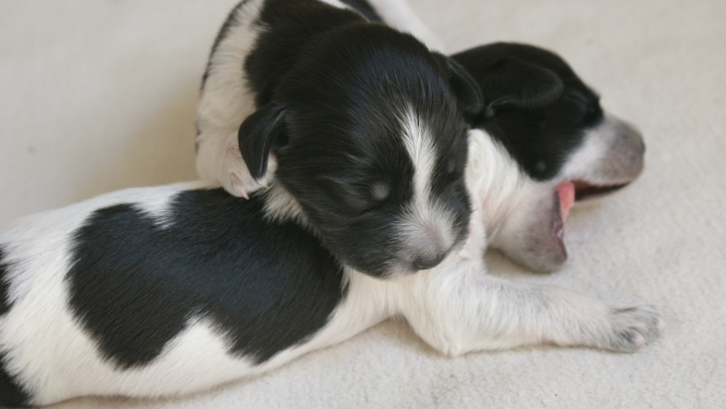 03.05.2011 Die zweite Woche ist angebrochen. Alles läuft bestens, die Welpen nehmen zu und entwickeln sich zusehens. Vor allem ihre Köpfe und ihr Fell haben sich bereits verändert. Ansonsten verbringen sie den Tag immer noch mit trinken und schlafen... noch sehr pflegeleicht!! Ab und zu ist sogar schon ein deutliches "Wau-wau" aus dem üblicheren Mauzen und Quieken herauszuhören. Meine Jungs sind ganz rührend mit den Welpen und wir genießen die Kuscheleinheiten auf der Couch, immer darum bedacht, jeden Welpen abwechselnd dranzunehmen.