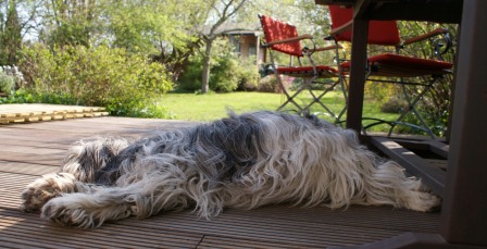 03.04.2011 Inzwischen hat auch Charlie aufgegeben, Lotta zum ausgelassenen Spiel zu überreden. Ansonsten geht es Lotta immer noch prächtig. Die ersten Rundungen sind zu ertasten und auch eine Wurfhöhle ist schon gefunden.... wie praktisch, man brauchte sie noch nicht mal zu buddeln! Hier wird auf jeden Fall immer häufiger Probe gelegen. Charlie hat indessen den Gartentisch für sich entdeckt,... als ob er ahnen würde, dass er sich besser schon mal nach vor Welpen sicheren Gefilden umsehen sollte!