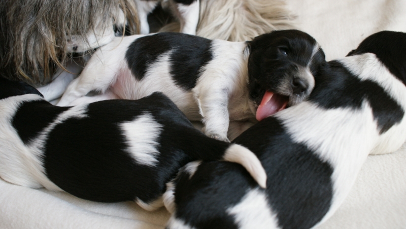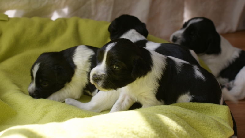 03.05.2011 Die zweite Woche ist angebrochen. Alles läuft bestens, die Welpen nehmen zu und entwickeln sich zusehens. Vor allem ihre Köpfe und ihr Fell haben sich bereits verändert. Ansonsten verbringen sie den Tag immer noch mit trinken und schlafen... noch sehr pflegeleicht!! Ab und zu ist sogar schon ein deutliches "Wau-wau" aus dem üblicheren Mauzen und Quieken herauszuhören. Meine Jungs sind ganz rührend mit den Welpen und wir genießen die Kuscheleinheiten auf der Couch, immer darum bedacht, jeden Welpen abwechselnd dranzunehmen.