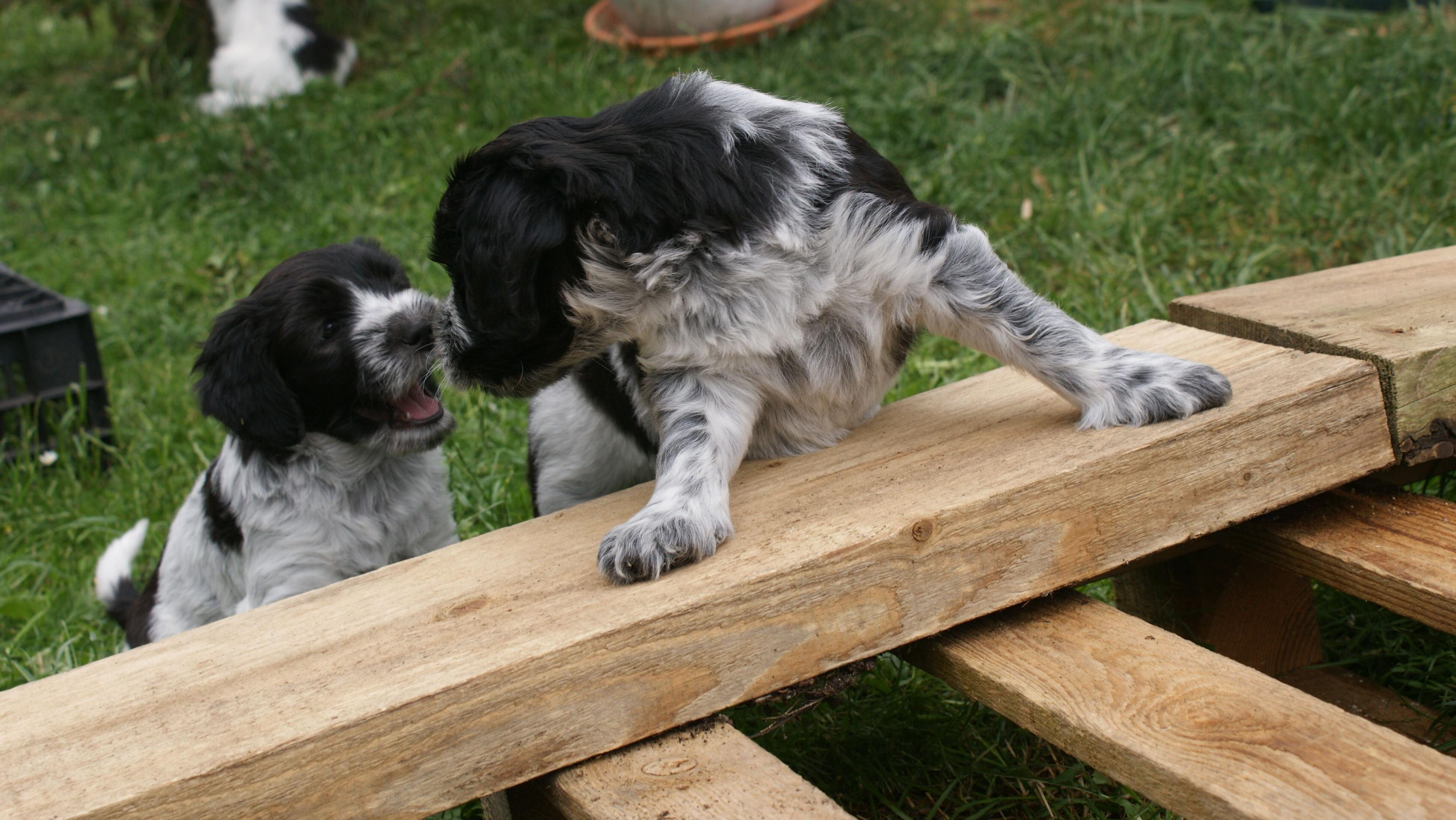 Lotta und Klecks30.06.2011 Wir verleben eine tolle, intensive Woche nur mit Klecks alleine. Sie fügt sich problemlos in unseren Alltag ein und ich genieße die paar Tage, in denen ich schon mal ein bisschen mit ihr streben kann. Sie macht schon Sitz, läuft brav nach und folgt meinem Pfiff auf dem Fuße, um sich ihr Leckerchen abzuholen. Sie apportiert wie selbstverständlich den Preydummy, erkundet neugierig Wald und Flur und benimmt sich auch schon ganz gut beim Autofahren und im Restaurant. Mit Lotta verstärkend an der Seite fällt alles auch etwas leichter. Lotta und Charlie genießen sichtlich die Ruhe und unsere alte Ordnung und flitzen wieder ausgelassen herum. Klecks wird einfach integriert, von Lotta betüddelt, bespielt und weiter erzogen und Charlie lässt sie sogar in seiner Nähe schlafen.