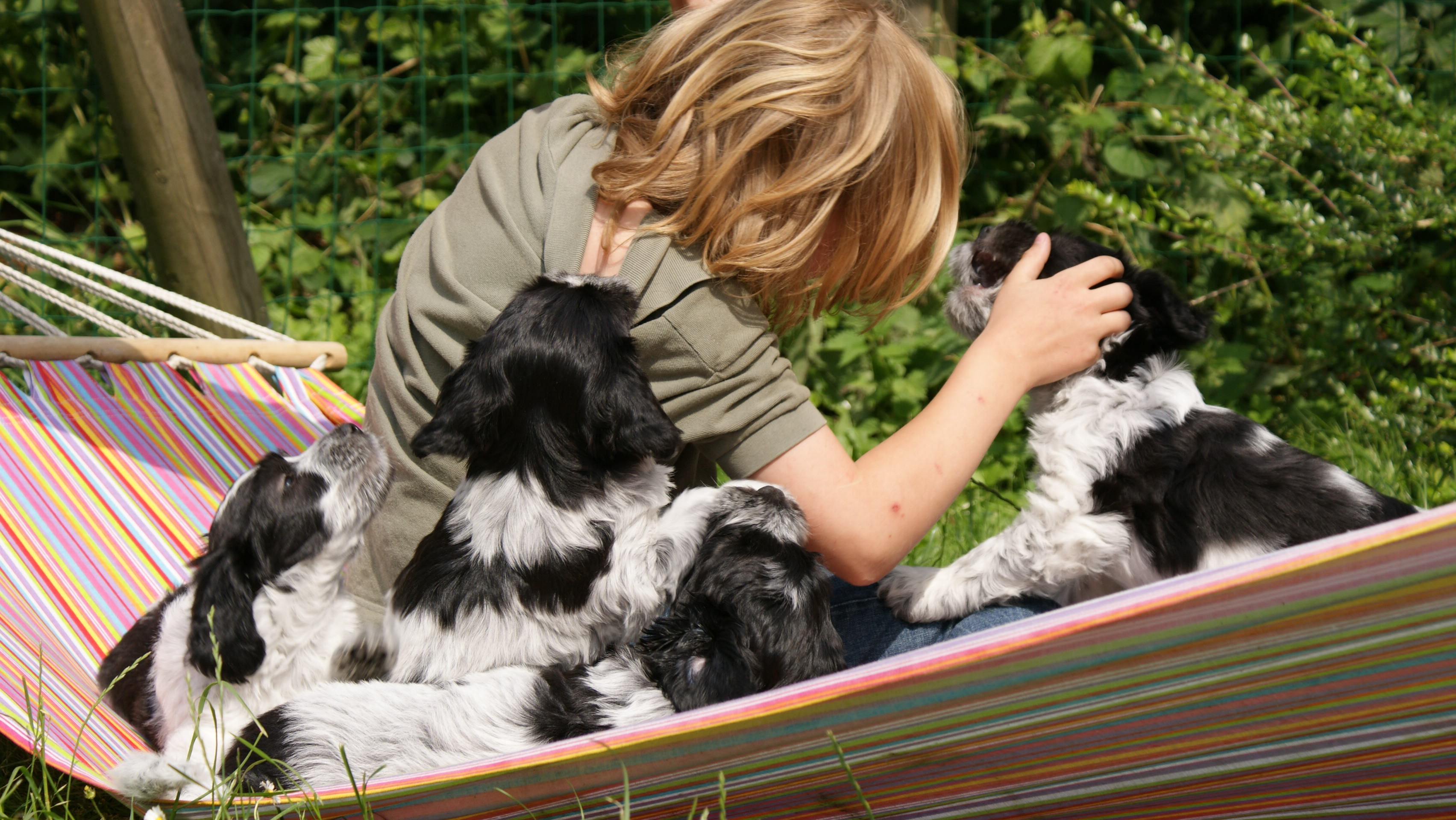 13.06.2011 Aus irgendeinem Grund konnte ich die Bilder der siebten Woche nicht mehr bearbeiten. Darum kurz ein kleiner Nachschlag unter "Siebte Woche.... 2". Vorgestern habe ich drei Stunden im geöffneten Kofferraum meines Autos verbracht.... mit jedem Welpen einzeln haben wir den vorbeirauschenden Autos gelauscht und nachher den Vorgarten erkundet... Dadurch ganz mutig geworden, ist die Bande dann heute erst mal gesammelt ausgebüchst... der EIGENTLICH SICHER ABGEZÄUMTE Rest des Gartens wurde inspiziert und die, zugegeben von mir dann inkonsequent extra niedrig gehängte, Hängematte erobert. Morgen kommt der Tierarzt und übermorgen wird der Wurf von Frau Recht, der Zuchtwartin, abgenommen... Bin schon ganz gespannt, was sie sagt, denn NATÜRLICH sind meines die süßesten Welpen des Universums :)...